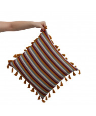 El Cojín Jalabil es una funda artesanal de 45 x 45 cm, tejida a mano en telar de cintura, siguiendo la técnica ancestral de los Altos de Chiapas. Los hilos entrelazados crean un efecto de rayas que evocan el traje tradicional de las mujeres de Aldama, mientras que los pompones alrededor recuerdan el tocado que utilizan en su cabello.