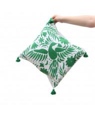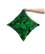 es una funda artesanal de 45 x 45 cm, bordada a mano con la técnica tradicional pata de gallo por mujeres otomíes de la colectiva ESMAS Bordadoras de Joyas Preciosas en San Nicolás, Tenango de Doria, Hidalgo.