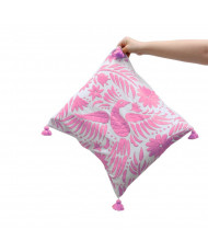 Su diseño presenta el motivo de pavorreal, acompañado de flores y elementos tradicionales, bordados en un solo tono, que aportan frescura y elegancia a cualquier espacio. El bordado está aplicado en la parte frontal, convirtiendo cada funda en una pieza única y significativa de la tradición textil otomí.