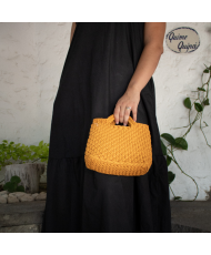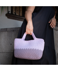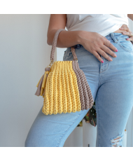 Bolsa tejida a crochet con trapillo, material textil elaborado a partir de tiras de tela reciclada, generalmente de algodón o lycra. Es resistente, flexible y ecológico, ya que a menudo proviene de sobrantes de la industria textil.