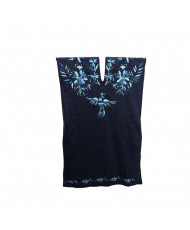 El Huipil de Tenango, confeccionado en lino y bordado en algodón está adornado con bordados en puntada de pata de gallo, que destaca por sus tonalidades azules. En el centro superior, un majestuoso diseño de un ave simboliza libertad y conexión con el mundo espiritual, mientras que flores en tonalidades azules decoran sutilmente tanto la parte superior como la inferior del huipil, evocando la fertilidad y la belleza de la naturaleza. Estos bordados no son solo decorativos, sino que tienen un profundo significado cultural, ya que reflejan la cosmovisión y tradiciones de la comunidad otomí de Tenango de Doria, Hidalgo.